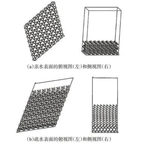 SiO2(001)元胞表面羥基化后,用十八烷基三氯硅烷(OTS)取代羥基進行硅烷化處理,并通過構(gòu)建超胞得到擴展表面。為消除周期邊界條件的影響,在表面添加35?真空層,得到SiO2疏水表面初始模型。優(yōu)化后的疏水表面結(jié)構(gòu)如圖1(b)所示,OTS的長鏈烷基在表面呈輕微傾斜的垂直規(guī)律排布。