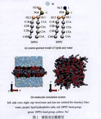本文利用粗粒化分子動(dòng)力學(xué)模擬方法,考察表面張力強(qiáng)度為80×10?5N·cm?1條件下磷脂膜的破裂過(guò)程。通過(guò)建立磷脂膜破裂臨界時(shí)間和臨界表面張力值的分析方法,采用電中性的二棕櫚酰磷脂酰膽堿(dipalmitoyl phosphatidylcholine,DPPC)和帶負(fù)電的二棕櫚酰磷脂酰甘油(dipalmitoyl phosphoglycerol,DPPG)作為磷脂膜組分,考察表面張力施加速率以及磷脂膜組成對(duì)磷脂膜破裂行為的影響規(guī)律。進(jìn)一步地,提出“動(dòng)態(tài)”微觀對(duì)抗理論以描述磷脂膜破裂過(guò)程的動(dòng)力學(xué),旨在為磷脂膜和磷脂膜元件的設(shè)計(jì)及其應(yīng)用提供理論指導(dǎo)。