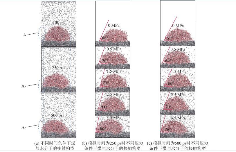 通過對(duì)比瓦斯壓力為3.5 MPa條件下,模擬時(shí)間為100、250、500 ps時(shí),煤與水分子接觸構(gòu)型(圖13a)可以獲得如下規(guī)律:隨著時(shí)間的增加,水分子逐漸在煤表面鋪展,接觸面寬度逐漸增加,通過觀察圖13a中的區(qū)域A可以明顯發(fā)現(xiàn)此規(guī)律。通過對(duì)比同一瓦斯壓力、不同時(shí)間條件下,煤與水分子接觸構(gòu)型(圖13b—圖13c)發(fā)現(xiàn):隨著時(shí)間的增加,煤與水分子之間的接觸角逐漸減小。綜合分析可知,在同一瓦斯壓力條件下,隨著時(shí)間的增加,水分逐漸在煤體表面鋪展,水與煤之間的接觸角逐漸減小。通過對(duì)比同一時(shí)間條件下(圖13b—圖13c)可知,隨著瓦斯壓力的增加,煤與水分子之間的接觸角逐漸增加,其原因是瓦斯壓力越大,水分子越不易在煤表面鋪展且不易進(jìn)入煤中,水分越不容易潤濕煤。