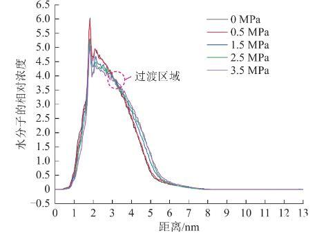 由圖14可知,在任意一個(gè)瓦斯壓力條件下,水分子濃度沿Z軸均會(huì)出現(xiàn)峰值點(diǎn)(1.825 nm),峰值點(diǎn)位于煤水交界面的上方,因?yàn)槊罕砻嫖接型咚?,所以峰值點(diǎn)沒有出現(xiàn)在煤表面。在峰值點(diǎn)的左側(cè),同一距離處,水分子濃度隨著瓦斯壓力的增加而減小,說明瓦斯壓力越大,水分子越不易進(jìn)入到煤中。在峰值點(diǎn)右側(cè)一定距離處(圖14過渡區(qū)域的左側(cè)),水分子濃度隨著瓦斯壓力的增加而減小,其說明瓦斯壓力越大,水分子越難在煤表面鋪展。然而,在圖14中過渡區(qū)域的右側(cè)一定范圍內(nèi),水分子濃度隨著瓦斯壓力的增加而增加,其說明瓦斯壓力越大,水分子越不易進(jìn)入煤中,反而越易聚集。