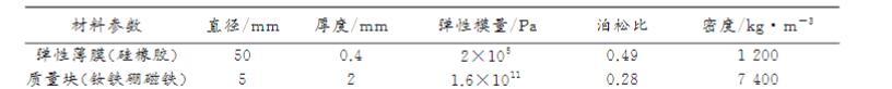 研究對象MAMs結(jié)構(gòu):彈性薄膜中心兩面粘結(jié)圓形質(zhì)量塊。薄膜采用硅橡膠,通過勻膠機(jī)制備:按硅膠與固化劑100:3比例混合,低速檔(500 rpm,30s)甩開膠液,高速檔(1000 rpm,30s)均勻涂布于硫酸紙基底,靜置30min后剝離得到。高速檔轉(zhuǎn)速不同會導(dǎo)致薄膜厚度不同(如表1不同轉(zhuǎn)速所得薄膜厚度,具體值因排版缺失未完整顯示)。實(shí)驗(yàn)中,薄膜制備厚度為0.4 mm。質(zhì)量塊采用釹鐵硼磁鐵。材料參數(shù)詳見表2。