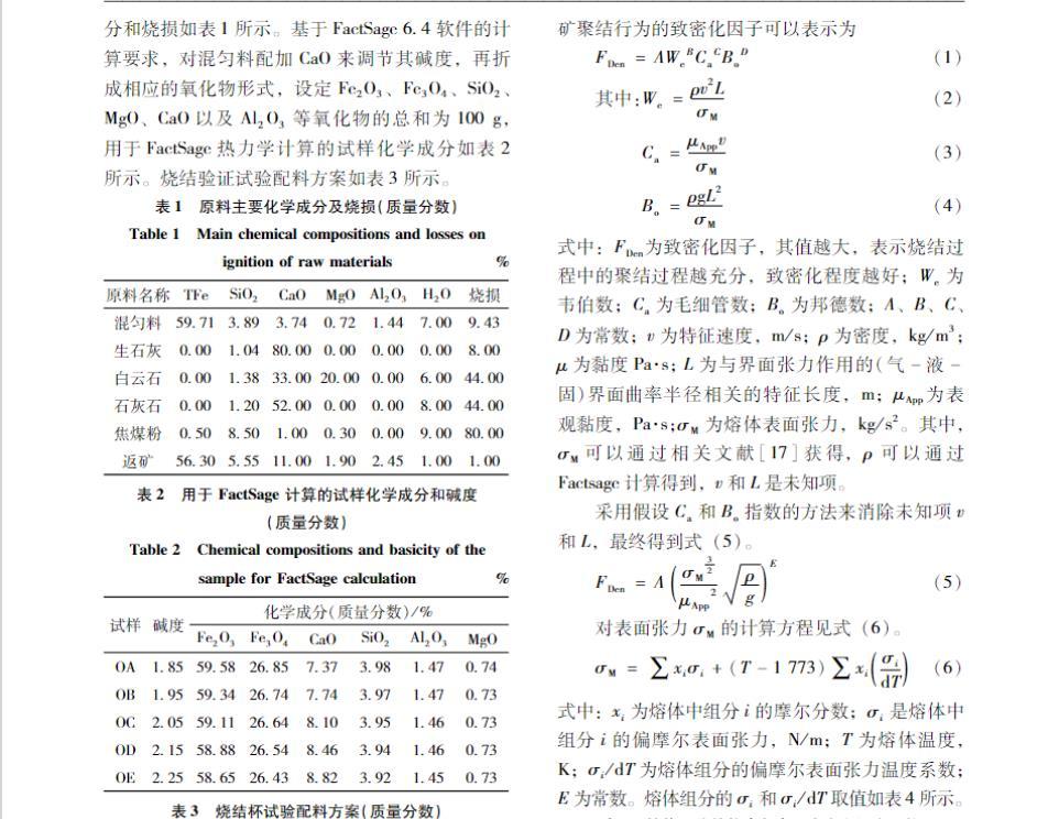 在燒結(jié)過程中,熔體的形成十分復(fù)雜,不可能直接測量熔體的物理性能,因此可以通過熔體成分來預(yù)測熔體的性能。液相聚結(jié)使得燒結(jié)礦孔表面積減少,通常認(rèn)為聚結(jié)行為受表面力、黏性力、慣性力和重力的綜合結(jié)果。因此,評估燒結(jié)礦聚結(jié)行為的致密化因子可以表示為: