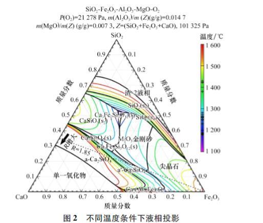 采用Factsage 6.4中“Equilib”模塊對不同堿度條件下的理論液相生成溫度以及不同溫度下的液相生成量進(jìn)行計(jì)算,結(jié)果如表7所示。在不同堿度條件下,燒結(jié)礦的液相生成量隨溫度的變化如圖1所示。通過“Phase Diagram”模塊計(jì)算SiO?-CaO-Fe?O?體系:氧分壓固定為21278 Pa,Al?O?組元固定為1.47%,MgO組元固定為0.73%情況下的液相投影,溫度區(qū)間設(shè)置為1100~1600℃,升溫梯度為50℃,計(jì)算結(jié)果如圖2所示(圖中s、s2、s4、s6代表同種物質(zhì)的不同晶體結(jié)構(gòu))。