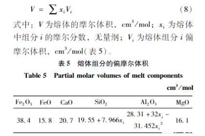 式中:V為熔體的摩爾體積,cm3/mol;x_{i}為熔體中組分i的摩爾分?jǐn)?shù),無量綱;V_{i}為熔體組分i偏摩爾體積,cm3/mol(表5)。