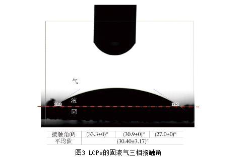 在食品工業(yè)中,濕潤(rùn)性好的成分可能更容易溶解或分散,從而改善食品的質(zhì)地、口感或加工性能。LOPs(固相)、水(液相)和空氣(氣相)三相之間形成的接觸角θ可用于表示LOPs對(duì)水分的親和能力。當(dāng)θ小于90°時(shí),固體顆粒優(yōu)先被水濕潤(rùn),θ越小,其在水中的濕潤(rùn)性及分散性越強(qiáng);θ大于90°時(shí),固體顆粒的親油性更強(qiáng);θ在90°左右,固體顆粒具有兩親性,有利于其在界面的吸附與排列。LOPs的固液氣三相接觸角圖片見(jiàn)圖3,LOPs壓片后與超純水和空氣3次接觸形成的接觸角均為銳角,經(jīng)OSA100型全自動(dòng)界面黏彈性測(cè)量?jī)x測(cè)得接觸角的平均值為(30.40±3.17)°。隨著時(shí)間的延長(zhǎng),最終水滴完全潤(rùn)濕了LOPs壓片,實(shí)驗(yàn)表明LOPs具有較好的親水性。