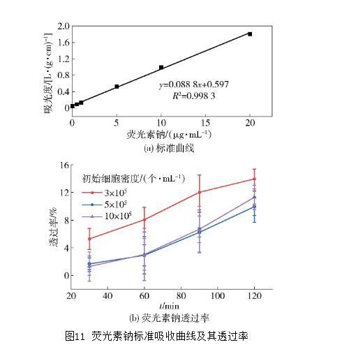 標(biāo)記物跨膜通量的測定也可以反映單層細(xì)胞膜的完整性,熒光素鈉標(biāo)準(zhǔn)吸收曲線及其在不同時間段的透過率見圖11。由圖11(a)的熒光素鈉的標(biāo)準(zhǔn)曲線方程中,代入BL側(cè)的吸光度,可計(jì)算出BL側(cè)的熒光素鈉質(zhì)量,根據(jù)式(4),即可得出不同時間段的熒光素鈉透過率[圖11(b)]。由圖11(b)可知,孵育2 h后,3個不同初始密度的細(xì)胞模型均對熒光素鈉具有一定的透過性。初始細(xì)胞密度為3×105個/mL的細(xì)胞模型對熒光素鈉的透過率相對較高,達(dá)到13.96%;初始AP側(cè)加入熒光素鈉的密度為20μg/mL,最終3種模型的熒光素鈉透過量均小于0.011 6μg/min,說明3種細(xì)胞模型單層膜的致密性能良好。