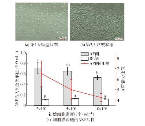 Caco-2細(xì)胞培養(yǎng)狀態(tài)及培養(yǎng)21 d后的堿性磷酸酶活性見圖10。由圖10(a)、(b)可以發(fā)現(xiàn),培養(yǎng)3 d過程中,單層Caco-2細(xì)胞生長穩(wěn)定并均勻分布在Transwell上,貼壁情況良好。堿性磷酸酶AKP是小腸刷狀緣細(xì)胞的標(biāo)志酶,其濃度代表了單層Caco-2細(xì)胞的極化和功能。觀察圖10(c)可知,培養(yǎng)21 d后,不同接種細(xì)胞密度在AP側(cè)的酶活性均高于BL側(cè)的酶活性,屬正常的細(xì)胞極化結(jié)果。初始密度為3×105個/mL的細(xì)胞AP側(cè)的AKP活性高于其他兩組,其BL側(cè)的AKP活性低于其他兩組,證明該組細(xì)胞分化情況較好。隨著細(xì)胞密度的增大,AP側(cè)與BP側(cè)活力的比值呈下降趨勢,說明初始細(xì)胞密度過大不利于細(xì)胞的分化。實(shí)驗(yàn)結(jié)果表明,3種模型細(xì)胞均生長良好。