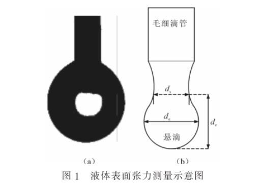 筆者采用液體表面張力的測量方法為懸滴法,即通過測量懸掛著的液滴的外形參數(shù)而推算出液體表面張力,如圖1所示。在憎水角測試儀配套的微量進樣器中滴出液滴,拍攝液滴照片,讀取液滴形態(tài)參數(shù)的像素值,根據(jù)測量滴管的實際尺寸和像素值,獲得像素值和實際尺寸的比例,換算實際液滴的尺寸參數(shù),并根據(jù)公式推算表面張力。