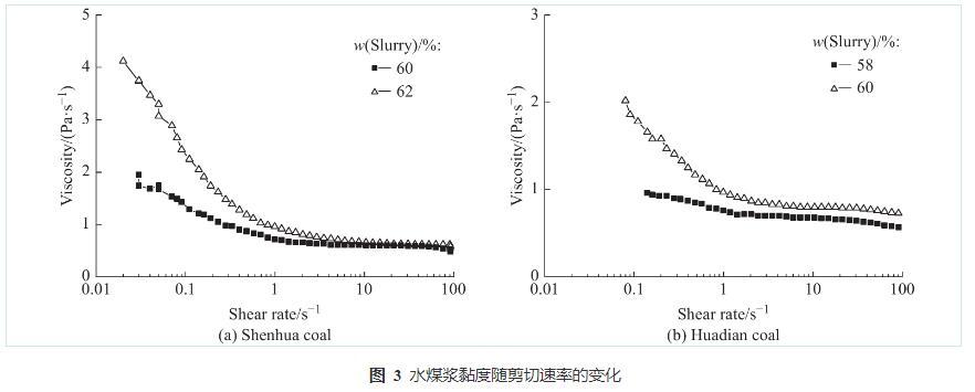 黏度、屈服應(yīng)力等水煤漿的流變特性對(duì)漿體破裂過程有重要影響。在水煤漿中,煤粉顆粒、分散劑和水形成了相對(duì)穩(wěn)定的三維空間結(jié)構(gòu),此時(shí)未被吸附、未參與形成緊密水化膜的自由水分布在這種三維結(jié)構(gòu)的空隙中。這種空間結(jié)構(gòu)在遭受剪切時(shí)很容易被破壞,從而導(dǎo)致分布在三維空間結(jié)構(gòu)空隙中的自由水被釋放,黏度降低;同時(shí),剪切應(yīng)力越大,水煤漿的黏度越小,所以水煤漿一般為剪切變稀的假塑性流體。