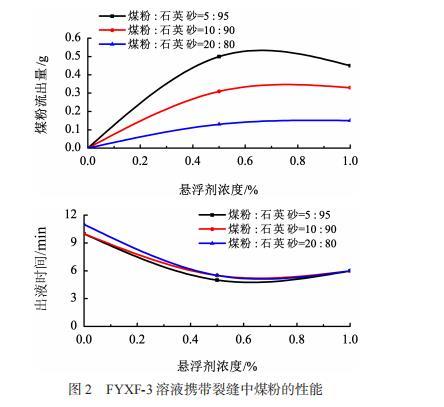 圖2為FYXF-3的濃度分別與出液時間、煤粉流出量的關(guān)系圖;圖3為煤粉:石英砂比例為5:95時的實驗現(xiàn)象圖。