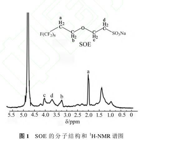 SOE的分子結(jié)構(gòu)和1H-NMR(D2O,400 MHz)譜圖如圖1所示。圖中SOE分子中所有氫的化學(xué)位移δ(ppm)如下:δa=2.02和δb=3.25分別為—CH2CH2O—中氫的化學(xué)位移,δc=4.03和δd=3.68分別為與磺酸離子直接相連的—CH2CH2—中氫的化學(xué)位移。溶劑(D2O)中殘余氫的δ為4.79。1H-NMR的表征結(jié)果說明樣品為目標(biāo)產(chǎn)物。