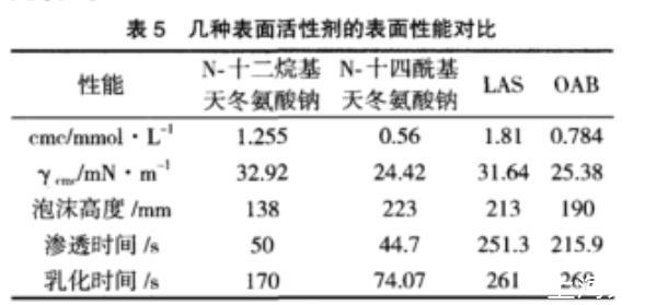 對N-十四?;於彼徕c鹽的幾項表面性能進行了測定,并與其他表面活性劑進行了對比,結(jié)果見表5。