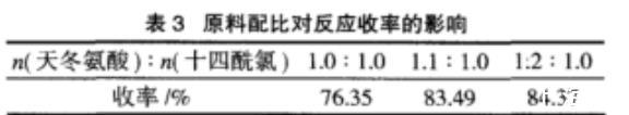 采用天冬氨酸稍過量,一方面可以抑制酰氯的水解,另一方面又有利于提純。選取n(天冬氨酸)∶n(十四酰氯)=1.0~1.2∶1.0。在反應(yīng)體系pH=10~11、反應(yīng)時間3.5h、反應(yīng)溫度5℃條件下,考察不同原料配比對反應(yīng)的影響,結(jié)果如表3所示。