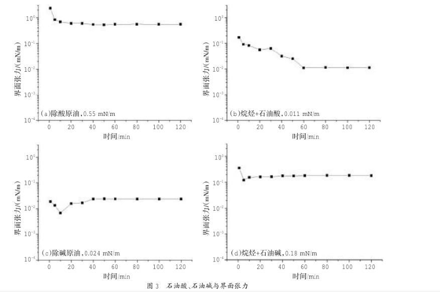 為研究遼河石油酸、石油堿與界面活性之間的關(guān)系,首先測(cè)量了遼河兩性表面活性劑與原油之間的界面張力,為0.005 2 mN/m,可以超低;也測(cè)量了表面活性劑與烷烴之間的界面張力,為1.38 mN/m,界面活性較差;在此基礎(chǔ)上考察石油酸、石油堿對(duì)降低界面張力的貢獻(xiàn)。由圖3可以看出,在原油剔除石油酸組分后,界面張力由超低陡然升高至0.55 mN/m,說明石油酸組分對(duì)超低界面張力的形成具有非常重要的作用,也說明在遼河油田的兩性表面活性劑二元復(fù)合驅(qū)中,石油酸組分依然發(fā)揮著原油活性物質(zhì)的作用;在烷烴組分添加石油酸后,界面張力由1.38 mN/m降低至0.011 mN/m,兩個(gè)數(shù)量級(jí)的降低,進(jìn)一步說明石油酸組分與遼河兩性表面活性劑之間具有明顯的相互作用,是有效降低界面張力的重要原油組分。