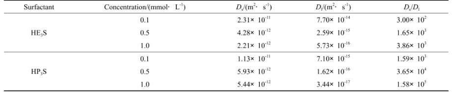 表2 HE3S和HP3S不同濃度水溶液的擴(kuò)散系數(shù)及其比值