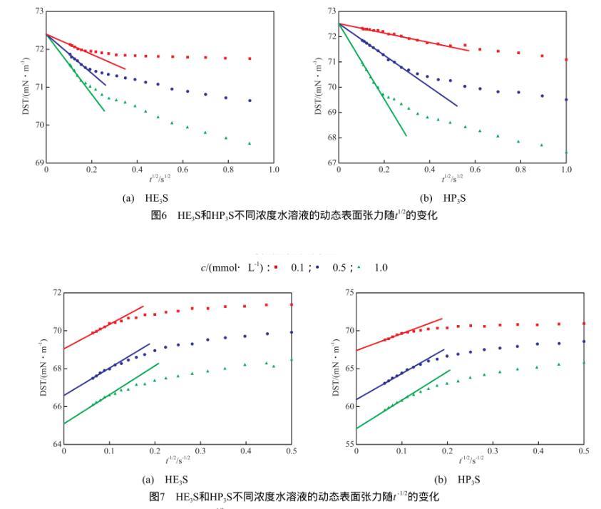 圖7 HE3S和HP3S不同濃度水溶液的動(dòng)態(tài)表面張力隨t-1/2的變化