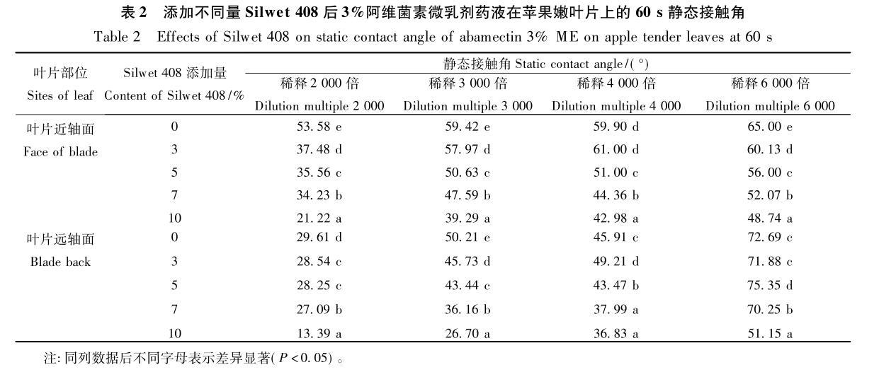 2.2添加不同量Silwet 408對(duì)阿維菌素微乳劑藥液在蘋果嫩葉片上靜態(tài)接觸角的影響