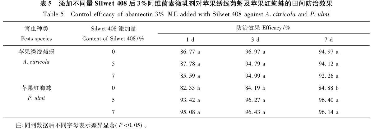 綜合表面張力、接觸角及室內(nèi)毒力測(cè)定結(jié)果,選擇Silwet408添加量分別為5%和7%的阿維菌素微乳劑藥液進(jìn)行了田間防效試驗(yàn)。結(jié)果(表5)與室內(nèi)毒力試驗(yàn)結(jié)果規(guī)律基本一致:添加Silwet408對(duì)提高阿維菌素微乳劑對(duì)蘋果紅蜘蛛田間防治效果作用顯著,而對(duì)蘋果繡線菊蚜防效的影響則不明顯,再次證明Silwet408雖可有效降低阿維菌素微乳劑的表面張力和接觸角,但卻未必一定能提高其對(duì)不同害蟲的防效。