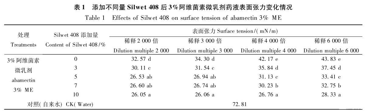 2.1添加不同量Silwet 408對(duì)阿維菌素微乳劑藥液表面張力的影響