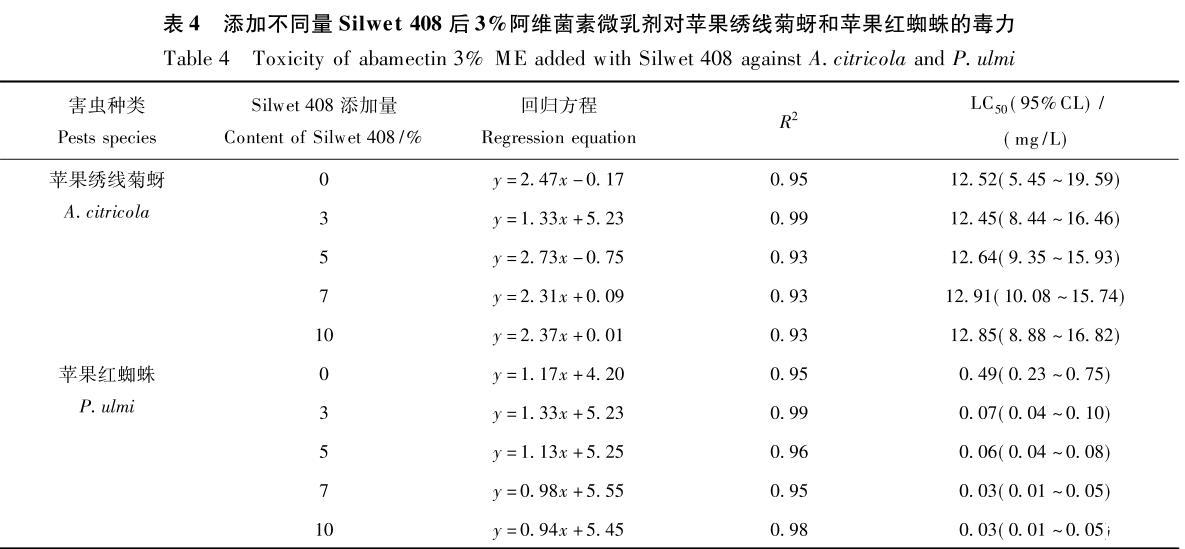 從表4中數(shù)據(jù)可看出:添加Silwet408可明顯提高阿維菌素微乳劑對(duì)蘋果紅蜘蛛的毒力,且隨助劑添加量的增加,藥劑LC50值降低;但添加Silwet408對(duì)阿維菌素微乳劑對(duì)蘋果繡線菊蚜的毒力并無明顯影響。說明Silwet408雖能降低藥液的表面張力及在靶標(biāo)葉面的接觸角,促進(jìn)藥液在葉片上的潤(rùn)濕性,但并不一定能提高其對(duì)害蟲的毒力。