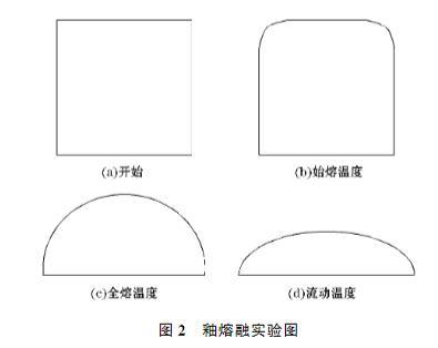 通過對釉料熔融實驗的觀察可以看到,隨著溫度升高,低共融物產(chǎn)生,試樣出現(xiàn)液相,逐漸變?yōu)槿垠w。四棱柱試樣最先變形的部位為頂部角點。由于角點是四棱柱曲率最大的部位(7/8的表面與空氣接觸),表面張力最大,表面能高,由表面張力產(chǎn)生的指向熔體內(nèi)部的附加壓力也最大,因此角點最先熔融變圓,此時試樣所處的溫度(1180℃),稱為釉的始熔溫度,釉層開始封閉,如圖2b所示。隨著溫度繼續(xù)升高,四棱柱的棱邊也開始熔融變圓,棱邊也是曲率較大的部位(3/4的表面與空氣接觸)。最后,四棱體的各個平面開始熔融變圓(1/2的表面與空氣接觸),整個試樣由于表面張力的作用變?yōu)榘肭驙?,此時的溫度(1260℃)稱為全熔溫度,如圖2c所示,形成平整、光滑的釉面。釉層雖然處于黏性流動狀態(tài),但黏度較大不至于流淌,因此接近于釉的成熟溫度。溫度繼續(xù)升高,試樣流散開來,高度降至原有高度的1/3時的溫度(1300℃)稱為流動溫度,見圖2d。此時由于溫度升高,熔體表面張力減小,同時釉熔體黏度降低,受重力作用熔體會產(chǎn)生自然流淌,熔體表面由球面變?yōu)闄E球面。