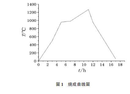 把磨好的釉料制成2cm×2cm×3cm正四棱柱試樣,置于窯門洞口內(nèi),借助于高溫顯微鏡可連續(xù)觀察其在加熱過程中的全部變化。本次實驗采用還原氣氛進(jìn)行燒制,實驗最高燒成溫度為1270℃,氧化和還原氣氛轉(zhuǎn)換溫度為980℃,圖1為燒成曲線圖。