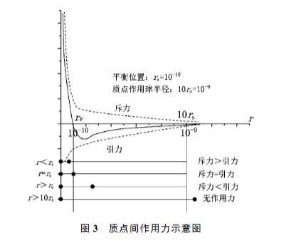 由熔體作用力理論可知,組成熔體的質(zhì)點間存在著作用力。當(dāng)質(zhì)點處于平衡位置時,即質(zhì)點間距r=r0(r0=10?1?)時,引力等于斥力,質(zhì)點間作用力為0;質(zhì)點間距r>r0,作用力為引力;質(zhì)點間距r<r0,作用力為斥力;當(dāng)質(zhì)點間距r>10r0時,引力和斥力均為0,如圖3所示。