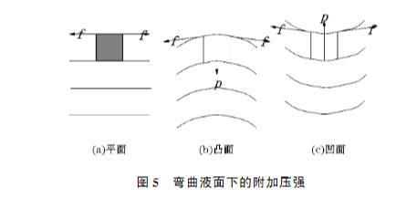 如果熔體表面是凸面,如圖5b所示,因表面張力沿周界與熔體面相切,則沿周界各個方向的表面張力f將產(chǎn)生一個指向熔體內(nèi)部的合力p(正壓力),使得熔體表面曲率變小。如果液面是凹面,如圖5c所示,表面張力的合力將指向熔體外部,對熔體則產(chǎn)生一個負(fù)壓力,使得凹面變平,甚至有可能轉(zhuǎn)化為凸面。由于表面張力的作用,熔體表面能夠截凸補凹,自動修復(fù),表面平滑,這正是陶瓷釉層表面能夠平整光滑的主要原因。