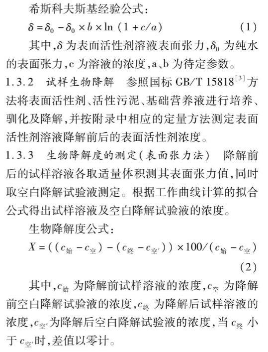 參照國標GB/T15818方法將表面活性劑、活性污泥、基礎(chǔ)營養(yǎng)液進行培養(yǎng)、馴化及降解,并按附錄中相應(yīng)的定量方法測定表面活性劑溶液降解前后的表面活性劑濃度。