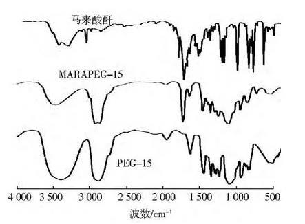 在MARAPEG-15曲線中,不存在酸酐中羰基C═O對(duì)稱和反對(duì)稱偶合振動(dòng)吸收峰(1 783,1 856cm-1)以及C—O—C伸縮振動(dòng)特征峰(1 268cm-1),也不存在羧酸的—OH的伸縮振動(dòng)峰(3 000cm-1)以及共軛羧酸C═O的特征峰(1 620cm-1),不存在蓖麻油酸中仲羥基特征峰(1 124cm-1),而存在與羰基共軛的C═C特征峰1 643cm-1,說明馬來酸酐與蓖麻油酸上的仲羥基進(jìn)行了酯化反應(yīng)。1 732cm-1處為蓖麻油酸的酯羰基的伸縮振動(dòng)峰,3 460cm-1處為醇羥基—OH特征峰,1 249cm-1處為伯醇的C—O伸縮振動(dòng)峰,2 925cm-1處為甲基、亞甲基伸縮振動(dòng)峰,1 111cm-1處為聚乙二醇中的醚鍵特征峰。以上分析說明產(chǎn)物結(jié)構(gòu)為MARAPEG-15。