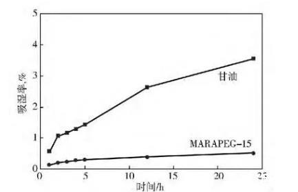 MARAPEG-15和甘油的吸濕性能和保濕性能見圖3、圖4。