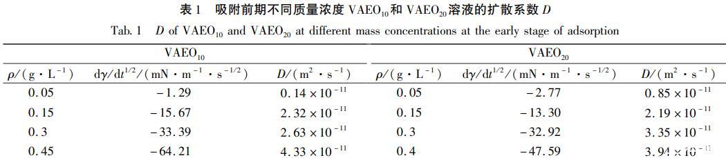 分析表1數(shù)據(jù):在VAEO溶液質(zhì)量濃度小于cmc時(shí),吸附前期擴(kuò)散系數(shù)D隨質(zhì)量濃度增大而增大,說(shuō)明擴(kuò)散系數(shù)D與質(zhì)量濃度有關(guān)。擴(kuò)散系數(shù)D隨濃度增大的情況,有研究認(rèn)為,可能的原因是隨著溶液質(zhì)量濃度增大,游離表面活性劑與水分子結(jié)合的乙氧基鏈段構(gòu)型發(fā)生變化,在擴(kuò)散過(guò)程中表面活性劑與水之間的作用力減弱,同時(shí)擴(kuò)散過(guò)程中靠近表面活性劑的水分子附近應(yīng)力場(chǎng)發(fā)生畸變,易形成空位和活化能降低,有利于后面表面活性劑的擴(kuò)散,這種狀況在游離的表面活性劑分子濃度達(dá)到頂峰時(shí),即cmc附近最為顯著,之后由于膠束的形成,會(huì)在一定程度上破壞這種行為,導(dǎo)致擴(kuò)散速率降低。當(dāng)質(zhì)量濃度大于cmc時(shí),短時(shí)間內(nèi),表面張力下降到很低的數(shù)值(見(jiàn)圖2),說(shuō)明短時(shí)間內(nèi)表面層已經(jīng)吸附一定量溶質(zhì)單分子,形成一定的表面壓,而表面壓可產(chǎn)生一定的吸附勢(shì)壘,影響分子從次表面層到表面層的擴(kuò)散速率,吸附轉(zhuǎn)而由混合動(dòng)力控制,此時(shí)溶液已不是稀溶液,方程(2)不再適用。