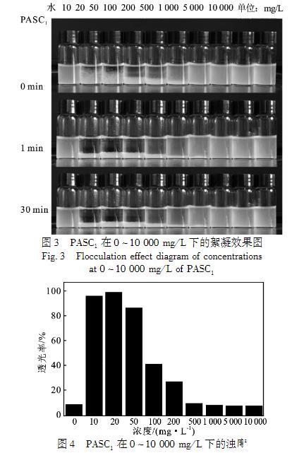 PASC1的絮凝效果見圖3、圖4.PASC1濃度為10——50mg/L時(shí),透過率接近100%,繼續(xù)增加PASC1的濃度,體系重新變得渾濁。隨著PASC1濃度的進(jìn)一步增加,體系的透過率降低,粘土顆粒懸浮體系重新穩(wěn)定。粘土顆粒的表面由于同構(gòu)取代而帶負(fù)電荷,這意味著需要陽離子達(dá)到電荷平衡。對(duì)于鈉基膨潤土(Na——BT),Na+離子被吸引到層空間中。當(dāng)Na——BT與水接觸時(shí),水可進(jìn)入晶層內(nèi)部,使可交換陽離子解離,在晶層表面建立擴(kuò)散雙電層,從而產(chǎn)生負(fù)電性。