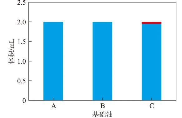 一般情況下,界面活性由小到大的順序?yàn)椋猴柡蜔N<芳烴<膠質(zhì)。重芳烴及膠質(zhì)組分中的極性物質(zhì)具有較強(qiáng)的界面活性,它們的存在可以降低油品與水的界面張力,使油品容易乳化。且復(fù)合劑的加入進(jìn)一步降低了油水的界面張力,導(dǎo)致油品乳狀液穩(wěn)定性增強(qiáng),其分水性變差。加入的復(fù)合劑可能與油品中所含芳烴和膠質(zhì)等極性化合物結(jié)合,導(dǎo)致基礎(chǔ)油分水性更差。所以基礎(chǔ)油中所含極性組分越多,其與加入的復(fù)合劑結(jié)合的程度就越強(qiáng),導(dǎo)致基礎(chǔ)油的分水性越差。結(jié)合表1進(jìn)行分析可知:基礎(chǔ)油A的黏度最小,且芳烴和膠質(zhì)等極性化合物含量最少,其分水性最好;基礎(chǔ)油C的黏度最大,且芳烴和膠質(zhì)等極性化合物含量最高,其分水性最差;基礎(chǔ)油B的黏度和極性組分含量比A大、比C小,其分水性能介于A與C之間。