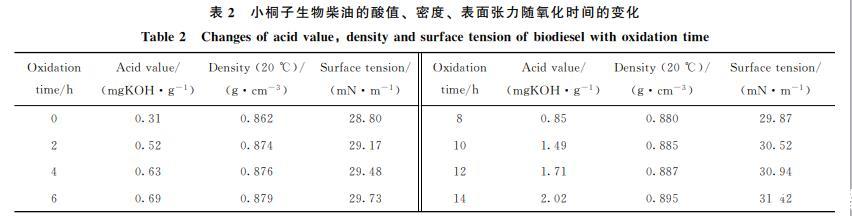 不同氧化時(shí)間小桐子油生物柴油的酸值、表面張力與密度的測(cè)定結(jié)果如表2所示。從表2可得,氧化14h的小桐子生物柴油的酸值由未被氧化時(shí)的0.31 mgKOH/g增加到2.02 mgKOH/g,增加了551%,超過(guò)ASTM D6751(2001)中規(guī)定生物柴油酸值的最大值(0.5 mgKOH/g)。這是由于小桐子生物柴油在氧化后期形成了一些醛類(lèi),如己醛和壬醛(見(jiàn)表1),這些醛類(lèi)經(jīng)過(guò)復(fù)雜的二次氧化反應(yīng)轉(zhuǎn)化為酸類(lèi)物質(zhì),從而導(dǎo)致酸值增加;同時(shí),生物柴油會(huì)吸收水分,導(dǎo)致酯的水解,也可使酸值增加。