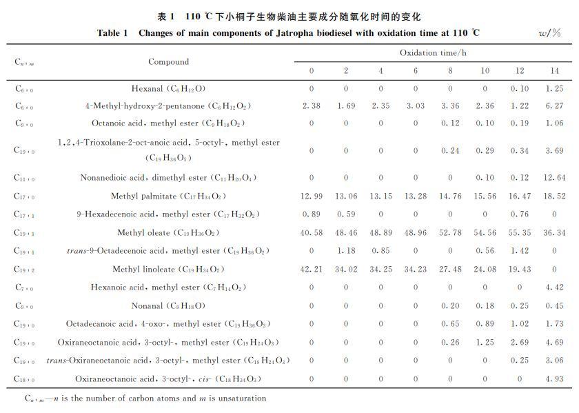小桐子生物柴油氧化期間GC-MS組成分析結(jié)果見(jiàn)表1。由表1可知,小桐子生物柴油的主要成分是棕櫚酸甲酯、油酸甲酯、亞油酸甲酯,歸一化后的質(zhì)量分?jǐn)?shù)為95.78%。在氧化過(guò)程中,含有2個(gè)碳碳雙鍵的亞油酸甲酯的含量降低,氧化0h的小桐子生物柴油亞油酸甲酯(C19:2)質(zhì)量分?jǐn)?shù)為42.21%,加速氧化14h,質(zhì)量分?jǐn)?shù)為0,說(shuō)明亞油酸甲酯幾乎完全氧化,這是因?yàn)槎嗖伙柡椭舅峒柞ケ葐尾伙柡椭舅峒柞ジ菀籽趸Ec單不飽和脂肪酸相比,亞油酸甲酯的碳鏈含有更多的雙烯丙基位點(diǎn),雙烯丙基質(zhì)子對(duì)氧自由基的攻擊敏感,導(dǎo)致分子發(fā)生氧化,從而形成過(guò)氧化合物,過(guò)氧化合物進(jìn)一步氧化轉(zhuǎn)化成醛、酮等化合物。