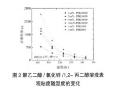 圖2聚乙二醇/氯化鋅/1,2-丙二醇溶液表觀粘度隨溫度的變化