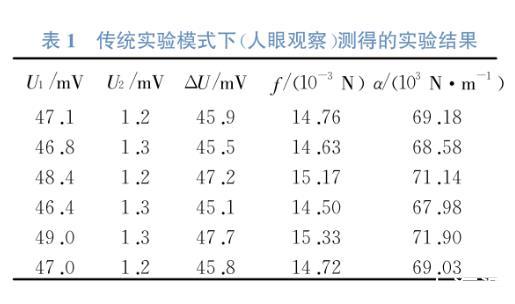 在用拉脫法測量液體表面張力系數(shù)實(shí)驗(yàn)中,最關(guān)鍵實(shí)驗(yàn)數(shù)據(jù)是記錄金屬環(huán)拉斷液柱前的瞬間數(shù)字電壓表讀數(shù)U1和拉斷液柱后的數(shù)字電壓表讀數(shù)U2;在實(shí)際的實(shí)驗(yàn)過程中,學(xué)生需要一邊觀察金屬環(huán)與液體表面的連接情況,一邊又要觀察實(shí)驗(yàn)儀器上顯示面板的數(shù)值變化,而金屬環(huán)與液面是瞬間脫離的,學(xué)生需要緊盯顯示面板觀察記錄電壓值的變化。由于“拉斷液柱”的過程變化太快,因此導(dǎo)致數(shù)字電壓表的數(shù)據(jù)變化也很快,僅依靠人眼睛觀察,很可能會(huì)來不及記錄數(shù)據(jù)的變化,或者記錄數(shù)據(jù)的時(shí)刻不夠準(zhǔn)確,從而增加了讀取數(shù)據(jù)的偶然因素,導(dǎo)致實(shí)驗(yàn)誤差過大[10-14]。此外,在這種模式下,學(xué)生對實(shí)驗(yàn)過程中表面張力的變化趨勢(電壓值變化趨勢)并沒有直觀地了解,難以發(fā)現(xiàn)其變化規(guī)律,也不了解各個(gè)階段拉力的具體變化。