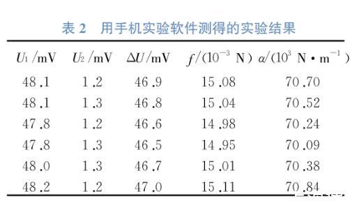 利用改裝后的液體表面張力系數(shù)測量儀和手機(jī)實(shí)驗(yàn)軟件記錄實(shí)驗(yàn)數(shù)據(jù),實(shí)驗(yàn)數(shù)據(jù)可在手機(jī)屏幕實(shí)時(shí)顯示,拖動(dòng)手機(jī)屏幕找到“拉斷液柱”時(shí)所對應(yīng)的數(shù)據(jù),測得的U1和U2數(shù)據(jù)如表2所示。