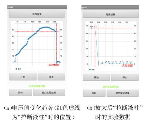2)手機(jī)實(shí)驗(yàn)軟件能將實(shí)驗(yàn)中所采集到的所有數(shù)據(jù)以坐標(biāo)點(diǎn)的形式描繪出電壓變化圖,在智能手機(jī)端可以方便地觀察到實(shí)驗(yàn)過程中表面張力的變化趨勢,使學(xué)生能深入了解實(shí)驗(yàn)過程中各個(gè)階段拉力的具體變化情況,從而可以更好地理解實(shí)驗(yàn)原理和實(shí)驗(yàn)過程。