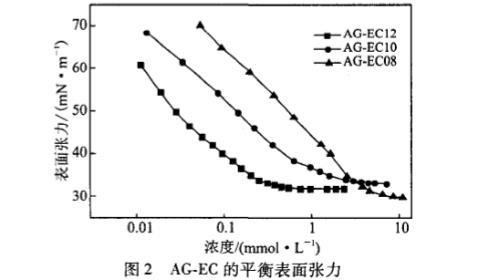 以去離子水為溶劑配制不同濃度的AG.EC溶液,靜置12 h后利用krussK12表面張力儀通過(guò)wilhelmy吊片法測(cè)定其平衡表面張力??刂迫芤簻囟?254-0.3)clC,測(cè)定前去離子水校準(zhǔn)表面張力儀至(72±0.3)mN/m。由表面張力()一濃度對(duì)數(shù)(1gc)圖,可得AG.EC在水中的臨界膠束濃度(cmc)以及cmc下的表面張力(一)。