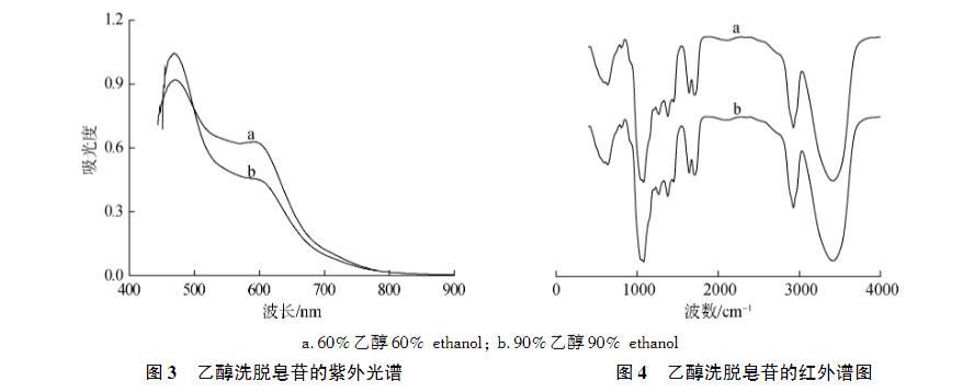 2種皂苷的紫外和紅外光譜見(jiàn)圖3和圖4。由圖3可知,2種皂苷樣品的紫外最大吸收波長(zhǎng)均在470 nm附近,且60%乙醇洗脫得到的皂苷吸光度低于90%乙醇洗脫得到的皂苷。