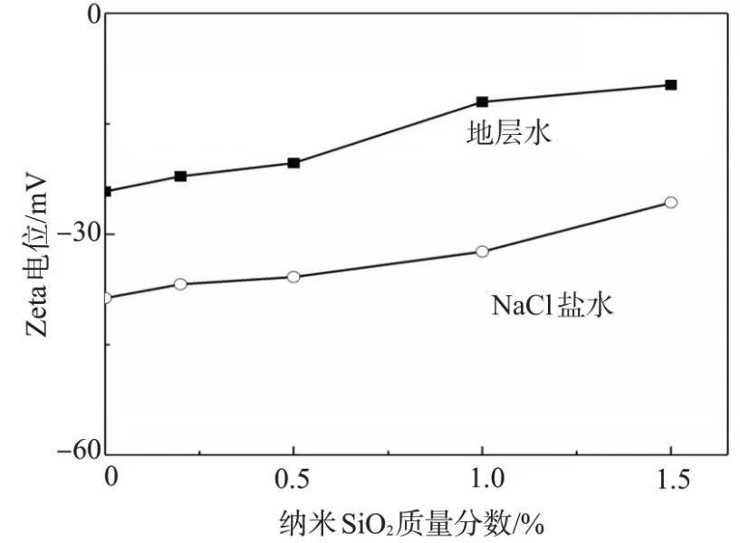 從圖2還可以看出,隨著納米SiO2含量的增加,用兩種鹽水配制體系的|ζ|均不斷降低,且納米SiO2的含量越大,顆粒之間的距離越小,由于布朗運(yùn)動相互碰撞聚結(jié)在一起的機(jī)率就越大,因此體系的穩(wěn)定性越差。