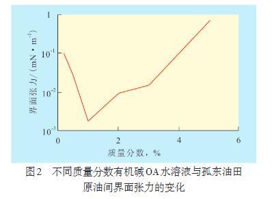 由水溶性好且不易揮發(fā)的有機(jī)堿OA水溶液在不同質(zhì)量分?jǐn)?shù)時(shí)與孤東油田原油之間界面張力的關(guān)系可以看出,當(dāng)有機(jī)堿OA水溶液質(zhì)量分?jǐn)?shù)為0.1%~1.0%時(shí),界面張力隨有機(jī)堿OA水溶液質(zhì)量分?jǐn)?shù)的增加迅速下降,當(dāng)有機(jī)堿OA質(zhì)量分?jǐn)?shù)超過1.0%后,界面張力逐漸升高。表明有機(jī)堿OA水溶液與孤東油田原油作用可降低界面張力,且最佳的有機(jī)堿OA水溶液質(zhì)量分?jǐn)?shù)為1.0%。