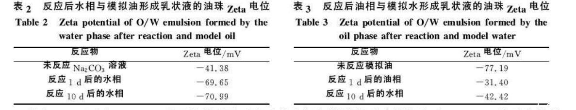 由表2可以看出,Na2CO3溶液與模擬油反應(yīng)后的水相與模擬油形成乳狀液,與Na2CO3溶液和模擬油直接乳化形成的乳狀液相比,油珠Zeta電位絕對(duì)值明顯增大;反應(yīng)10d的與1d的相比,變化很小。這是由于Na2CO3溶液與模擬油反應(yīng)后生成一些界面活性物質(zhì)溶于水相中,電離后帶負(fù)電荷,與模擬油乳化時(shí),帶負(fù)電荷的界面活性物質(zhì)吸附在油珠表面上,使油珠表面帶更多負(fù)電荷,從而使油珠Zeta電位絕對(duì)值增大。隨著反應(yīng)時(shí)間的延長,生成的界面活性物質(zhì)逐漸增多,油珠Zeta電位絕對(duì)值也繼續(xù)增大,但增大的幅度很小。