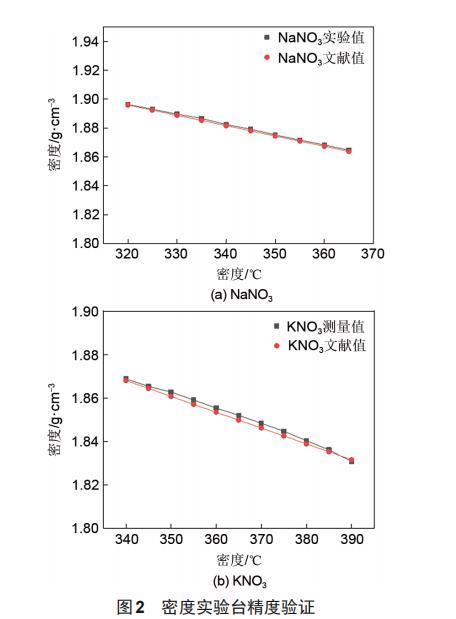 本實(shí)驗(yàn)采用去離子水作為已知液體,由式(3)得到重錘的體積為2.4388~cm^3。對重錘體積進(jìn)行標(biāo)定后,通過對KNO3、NaNO3的密度進(jìn)行測量,驗(yàn)證實(shí)驗(yàn)臺精度,兩種熔融鹽的密度測量結(jié)果與文獻(xiàn)中的密度進(jìn)行比較。