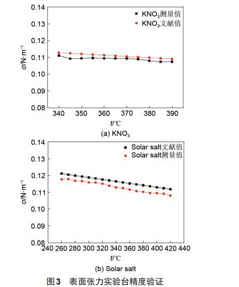 本實(shí)驗(yàn)先對NaNO3的表面張力進(jìn)行測量,得到儀器系數(shù)C。由式(4)可知,儀器系數(shù)C與溫度無關(guān),對NaNO3在5個(gè)溫度工況點(diǎn)下的表面張力進(jìn)行測量,并且每個(gè)溫度工況點(diǎn)采集3次測實(shí)驗(yàn)數(shù)據(jù),通過最終的計(jì)算得到本實(shí)驗(yàn)臺的儀器系數(shù)C=0.00053。對KNO和solar salt的表面張力進(jìn)行測量后,與文獻(xiàn)值進(jìn)行對比,如圖3所示。