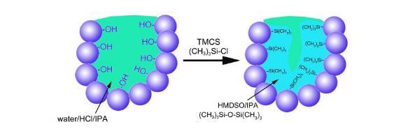 如圖6所示,采用三甲基氯硅烷(trimethyl chlorosilane,簡(jiǎn)稱(chēng)TMCS)對(duì)氧化硅凝膠孔壁表面進(jìn)行疏水化處理,可實(shí)現(xiàn)常壓干燥制備氣凝膠。其中TMCS和異丙醇(isopropanol,簡(jiǎn)稱(chēng)IPA)分別作為疏水化試劑和溶劑。TMCS與靠近顆粒表面的孔反應(yīng),使孔壁表面的Si-OH轉(zhuǎn)化成硅甲基,有利于阻止水的吸附,形成孔表面疏水區(qū)域。同時(shí),TMCS水解縮合生成六甲基二硅氧烷(hexamethyldisiloxane,簡(jiǎn)稱(chēng)HMDSO),且不與水混溶,隨著反應(yīng)的持續(xù)進(jìn)行,水相逐漸從孔中排出,最終形成超疏水氣凝膠。