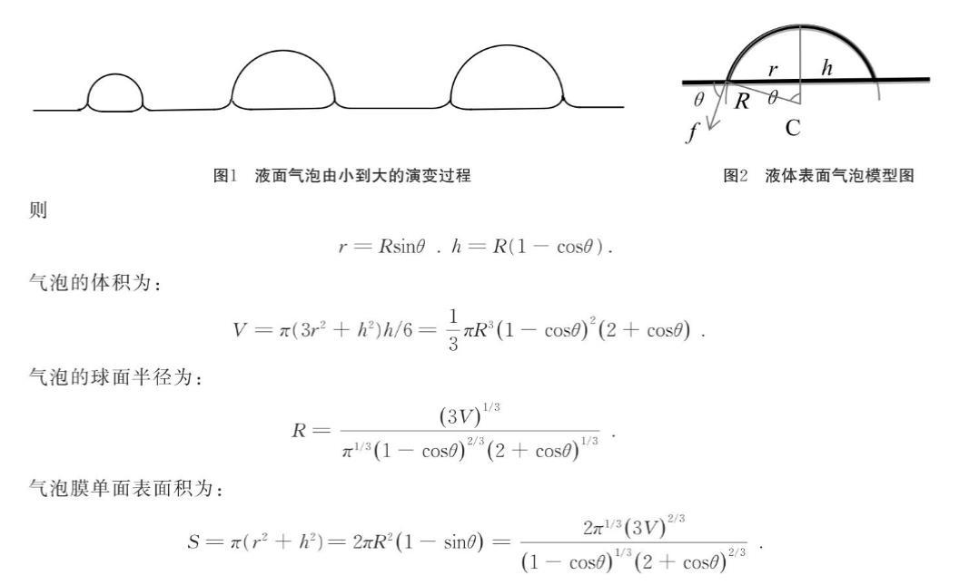 氣泡一般是由于氣體通過小孔浸人液體層后分散擴(kuò)張形成的.在氣泡形成過程中,由于液體表面張力的作用,使液膜呈收縮趨勢.球形氣泡的液膜表面積最小,所以,在沒有其他因素影響的條件下,空中和液體中的氣泡應(yīng)處于球形的亞穩(wěn)狀態(tài).當(dāng)氣泡落在液體表面或由液體內(nèi)部上升到液體表面以后,沒破裂的氣泡不再呈現(xiàn).球形狀態(tài),與液體表面直接形成的氣泡一樣,呈現(xiàn)球缺形狀.液面氣泡由小到大的演變過程如圖1所示.當(dāng)氣泡足夠大時,液體表面氣泡實際形狀接近半球,但在氣泡與液體表面接觸處可觀察到氣泡內(nèi)、外均存在液面向上彎曲現(xiàn)象,且泡內(nèi)水平液面相比氣泡外水平液面位置出現(xiàn)微小凹陷.