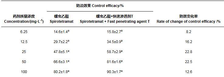 表5添加快速滲透劑T后22.4%螺蟲乙酯懸浮劑對(duì)石斛菲盾蚧田間防效的變化